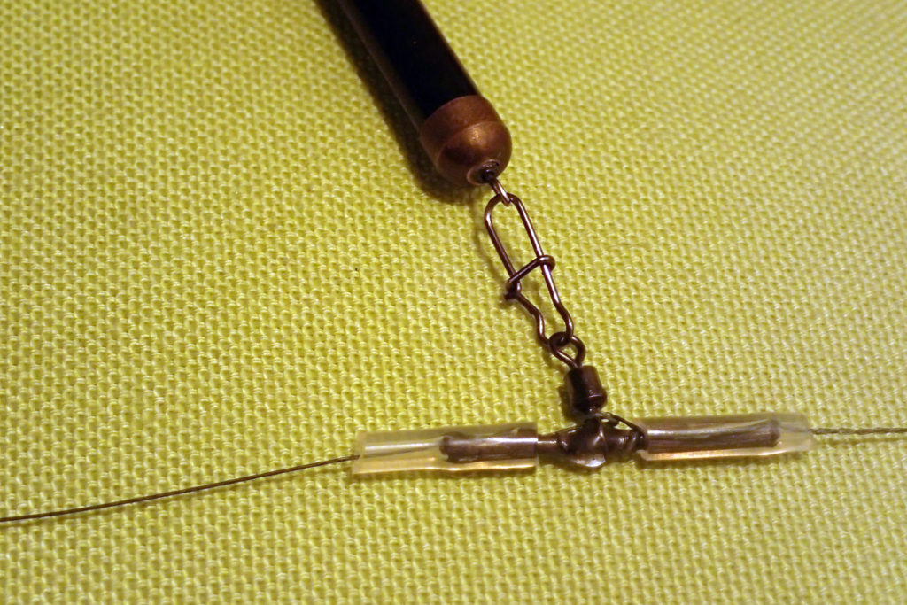 Kuvateksti: Muista lukita kiinnike pyöräyttämällä siima kertaalleen kiinnikkeen rungon, eli tässä tapauksessa leikarin ympäri. Näin estät kiinnikkeen irtoamisen tai liukumisen siimassa.