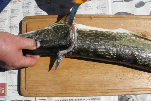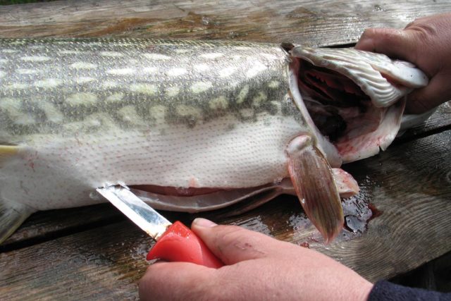 Perkaa verestetty hauki avaamalla sen vatsa ja poistamalla sisälmykset.