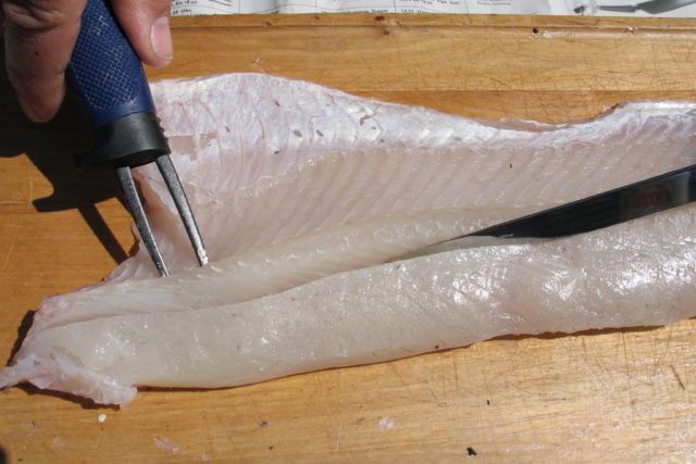 Lihasruotorivi sijaitsee fileen sisäpuolella fileen paksussa selkälihaksessa. Etsi se vetämällä veitsenkärkeä tai sormenpäätä fileen pinnalla niskapuolelta alkaen pyrstöä kohti. Leikkaa lihasruotorivin yläpuolelle ruotoihin asti ulottuva viilto ja vedä veistä kevyesti pyrstöä kohti. Ruodot tuntuvat veitsen kärjessä, mutta terä ei mene niistä läpi. Peräaukon kohdalla ruotorivi loppuu ja veitsen voi painaa fileen läpi.