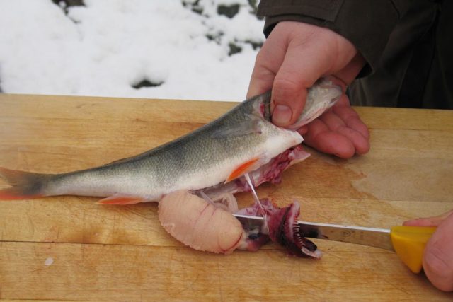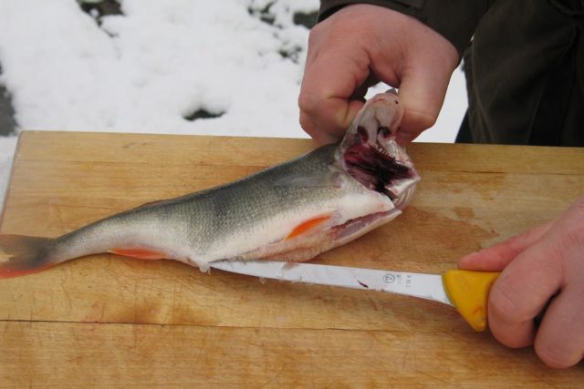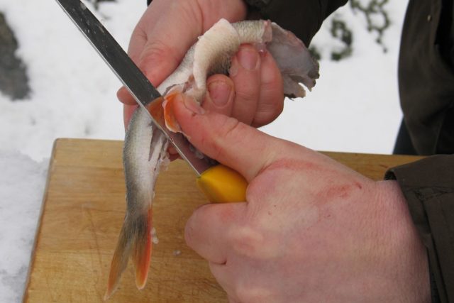 Työnnä veitsi kärki edellä ja terä pystyasennossa pään puolelta kidusten läpi ensimmäisen kidusviillon kautta peräaukkoon saakka. Terällä ei leikata, vaan veitsenlappeella kammetaan kidukset ja sisälmykset ulos.