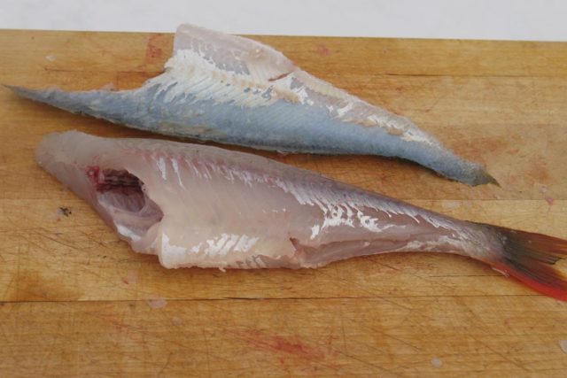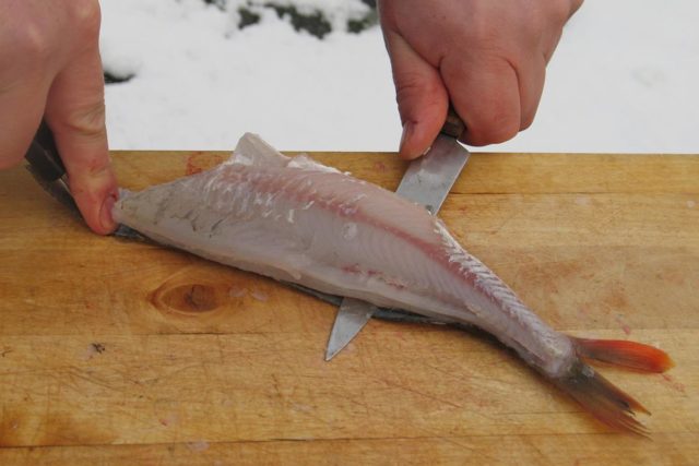 Repäise selkäevät irti pyrstön tyvestä alkaen, jolloin kaikki evän terävät tukiruodot saadaan poistettua.