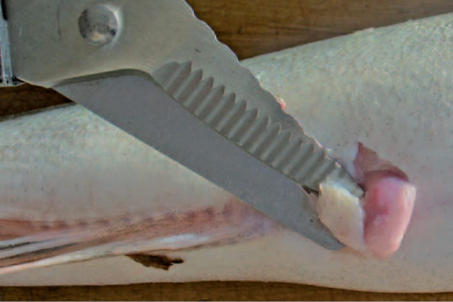 Leikkaa etummaisen aukon kautta kuhan uimarakko halki ja poista rakon alta paljastuva munuaisveri harjaamalla selkärangan kummaltakin puolelta pienikokoisella hammas- tai pulloharjalla.